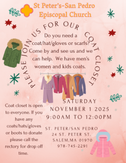 Missions is joining the Coat Collection at St Peter’s-San Pedro Episcopal Church in Salem. We are asking our church community to consider donating gently used items as you change from your summer to winter clothing. We are collecting coats, jackets, scarves, gloves, and hats for adults and children. Please place your donations in the baskets in the narthex.